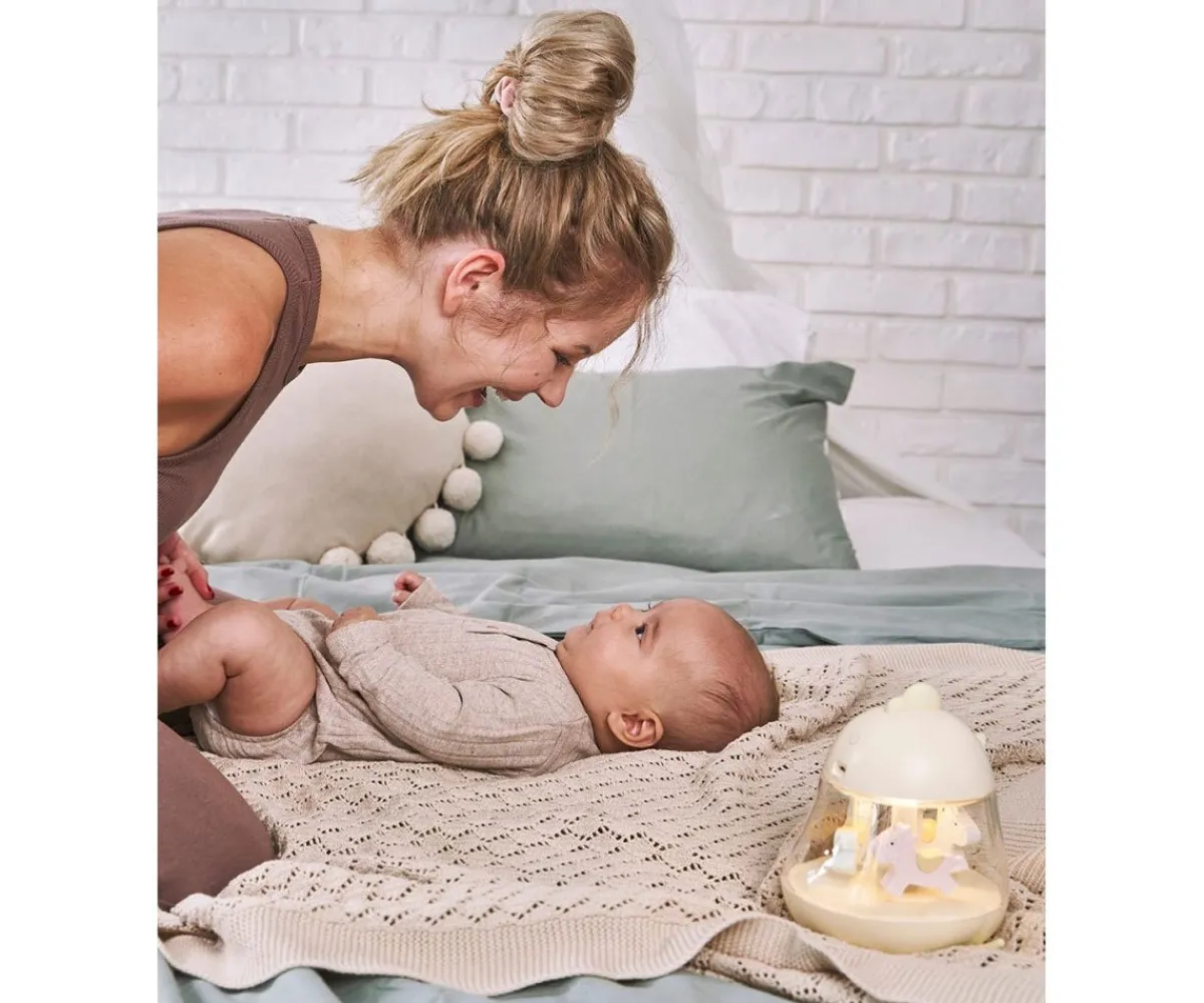 Un original artículo 2 en 1 de la marca Rabbit & Friends, se trata de una caja de música tipo carrusel que emite una suave melodía y calmará a tu peque ofreciendo un ambiente dulce y relajado, y a su vez es también una lámpara nocturna, con diferentes intesidades y colores de luz, que los acompañará a la hora de ir a la cama.