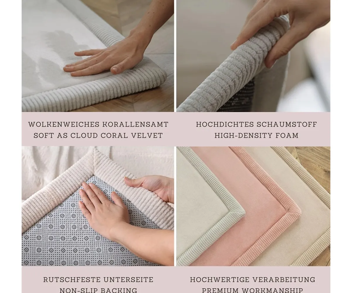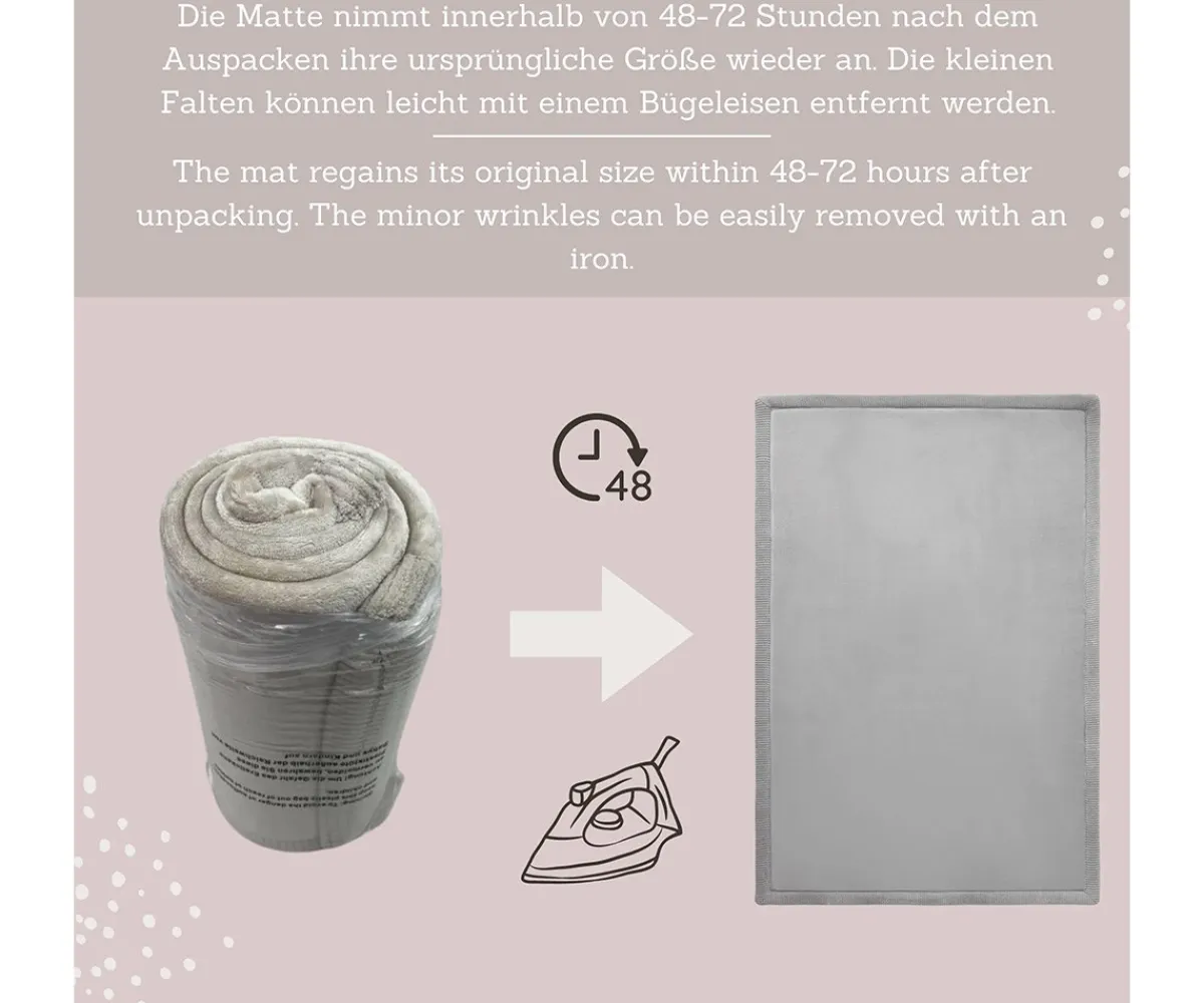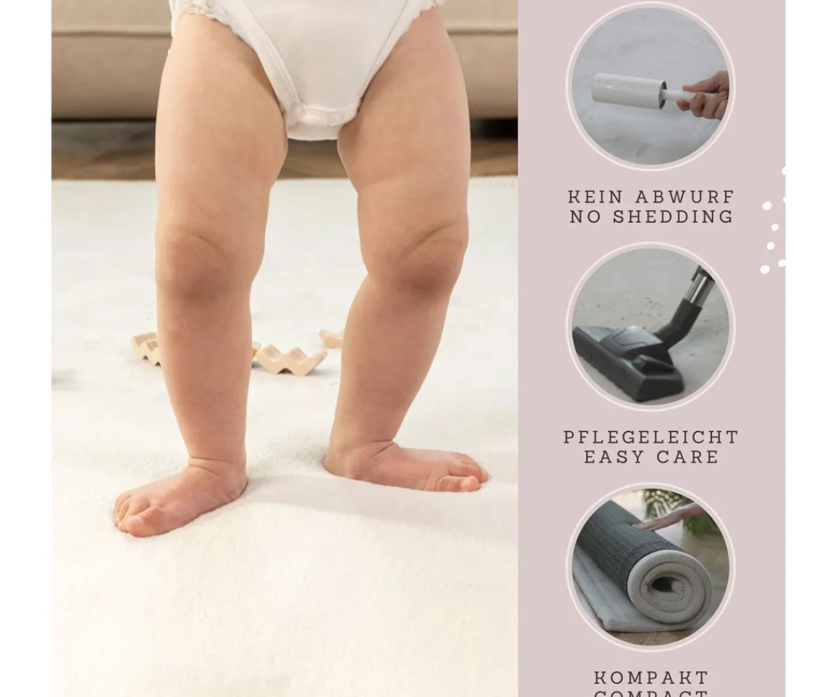 La alfombra infantil nube está formada por 3 capas: una capa de terciopelo coral para un contacto más suave con la piel, otra capa de espuma viscoelástica de alta densidad para jugar y gatear cómodamente y su parte de abajo antideslizante para proteger contra golpes al caerse.