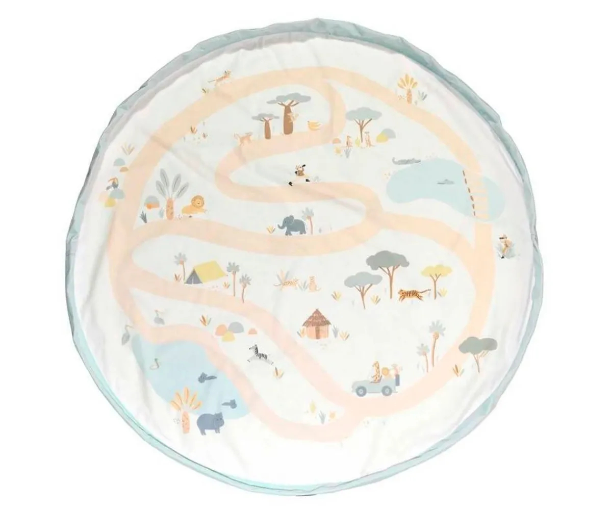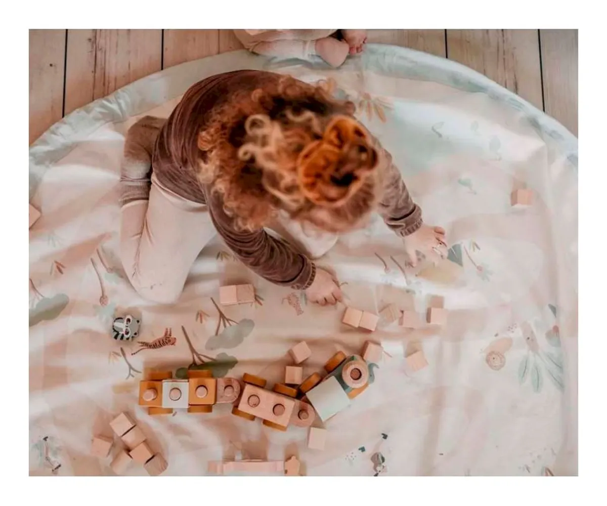 Este saco se desdobla y se convierte en una manta de juegos donde el niño puede jugar con todas sus juguetes, grandes y pequeños, y cuando llega la hora de acostarse, sólo hay que cerrarla y ya está todo recogido.