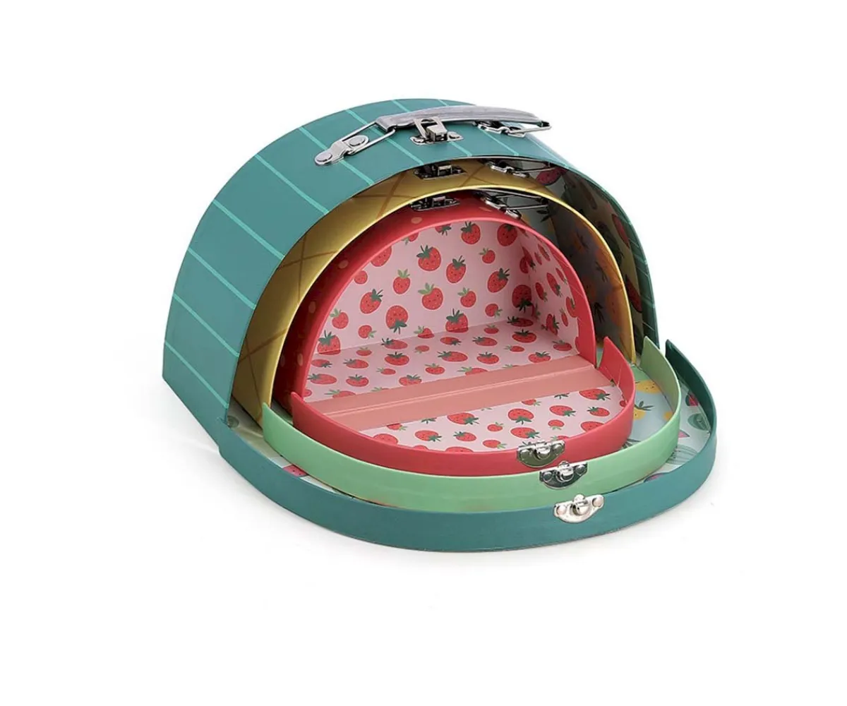 Set de 3 coloridas y divertidas maletas de cartón, ilustradas por Sarah Betz de Vilac. Con diseños frutales de sandía, piña y fresa, estimulan la imaginación, desarrollan la motricidad fina y ayudan a mantener el orden. Perfectas para guardar juguetes, jugar a viajar o decorar con un toque divertido y colorido la habitación.