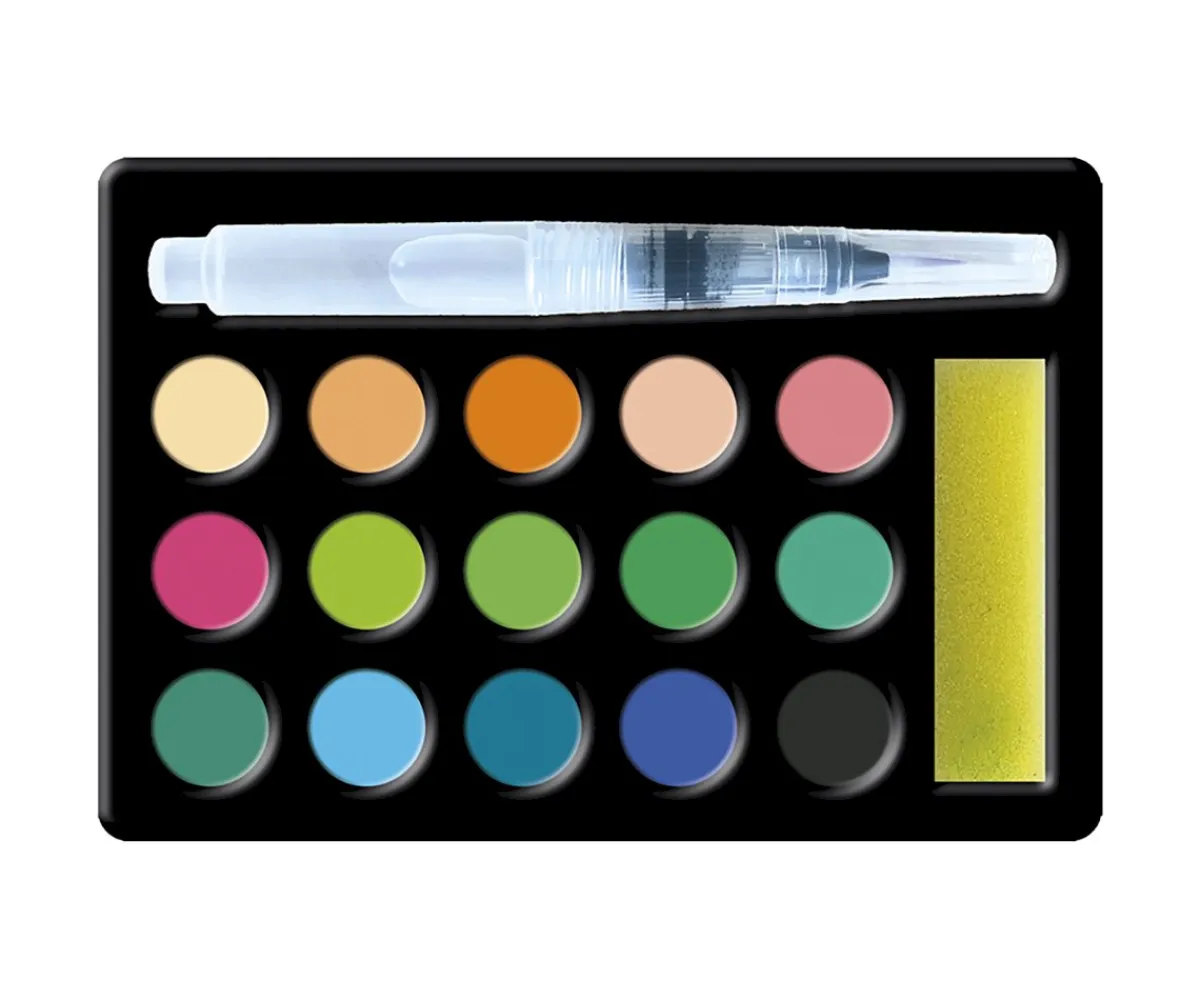- Contiene 2 cuadros para pintar (uno de ellos, con detalles dorados), 1 paleta de acuarela (15 botecitos, 1 esponja, 1 rotulador con punta de pincel y depósito de agua), 1 marco para pintar.