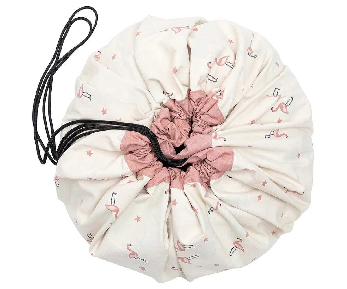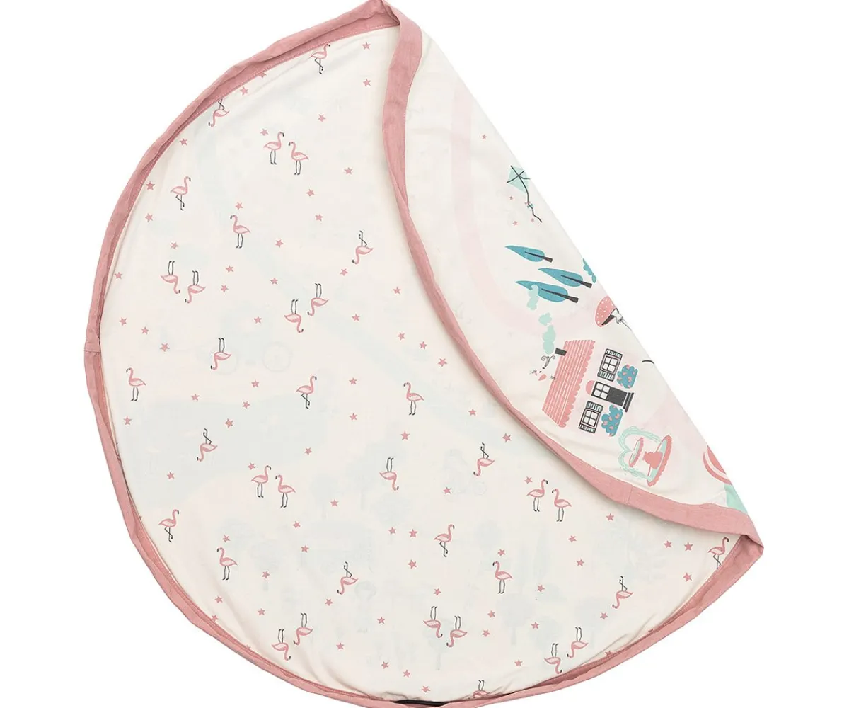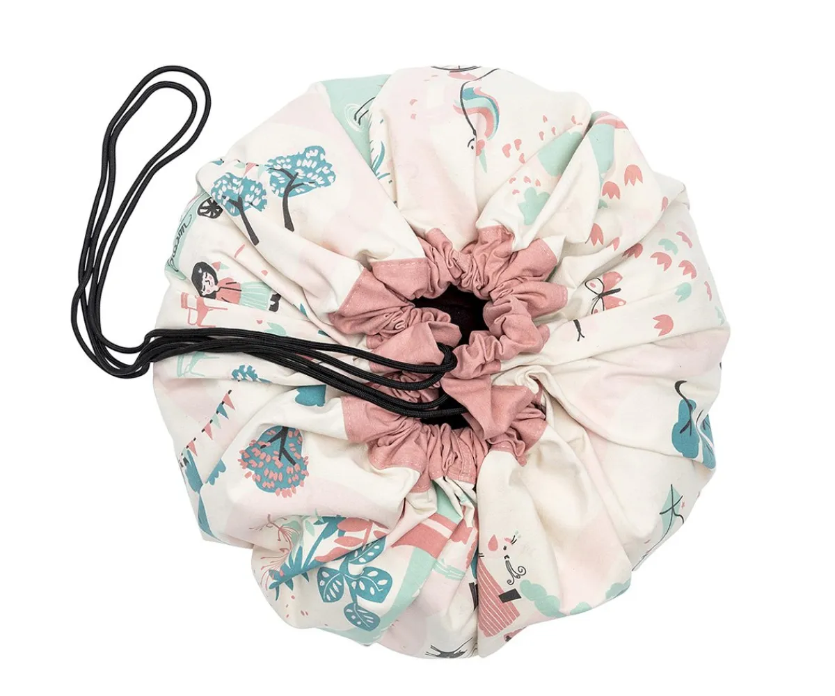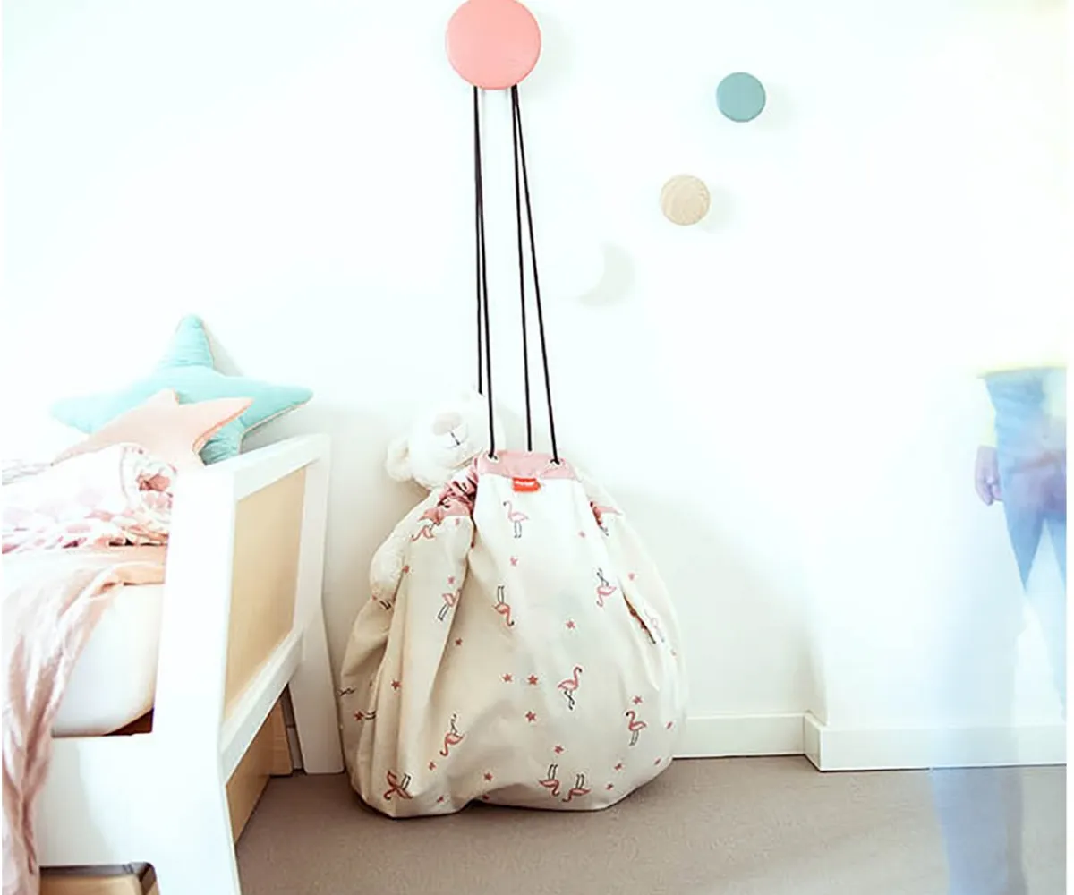 Este saco se desdobla y se convierte en una manta de juegos donde el niño puede jugar con todas sus juguetes, grandes y pequeños, y cuando llega la hora de acostarse, sólo hay que cerrarla y ya está todo recogido.