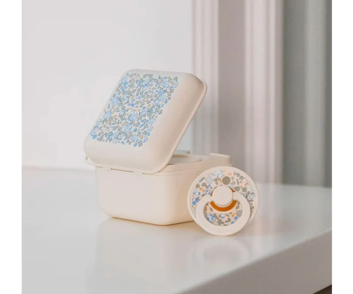 Te presentamos la caja portachupetes de BIBS con su diseño más exclusivo que trae de la mano de Liberty inspirada en sus estampados de flores.