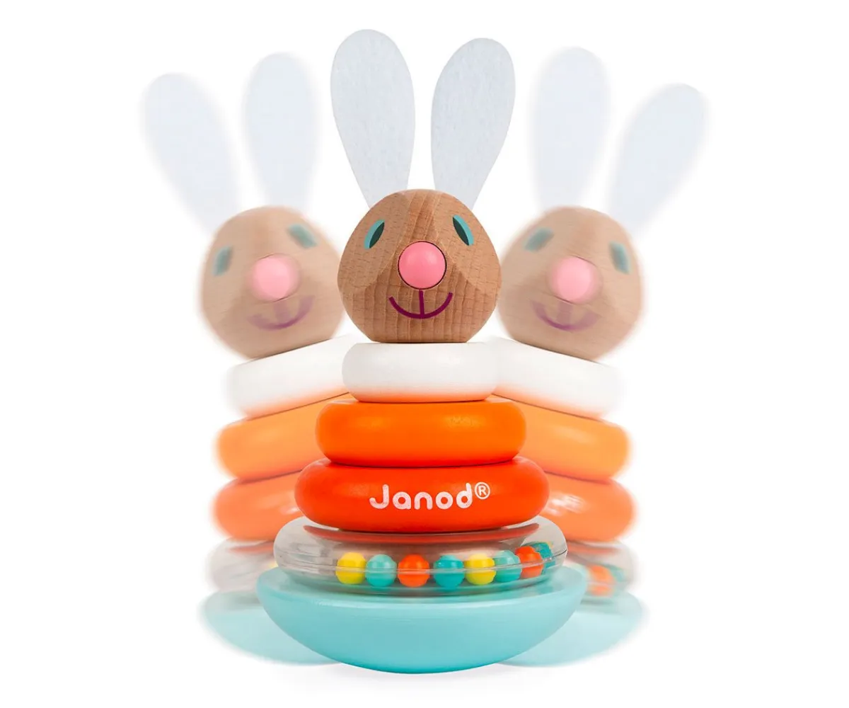 Este simpático conejito apilable es muy divertido y le encanta columpiarse sin cesar. Consta de cuatro piezas y un tentitieso que se balancea. En la base hay un anillo transparente que contiene unas bolitas de colores que bailarán cuando el conejito se mueva.