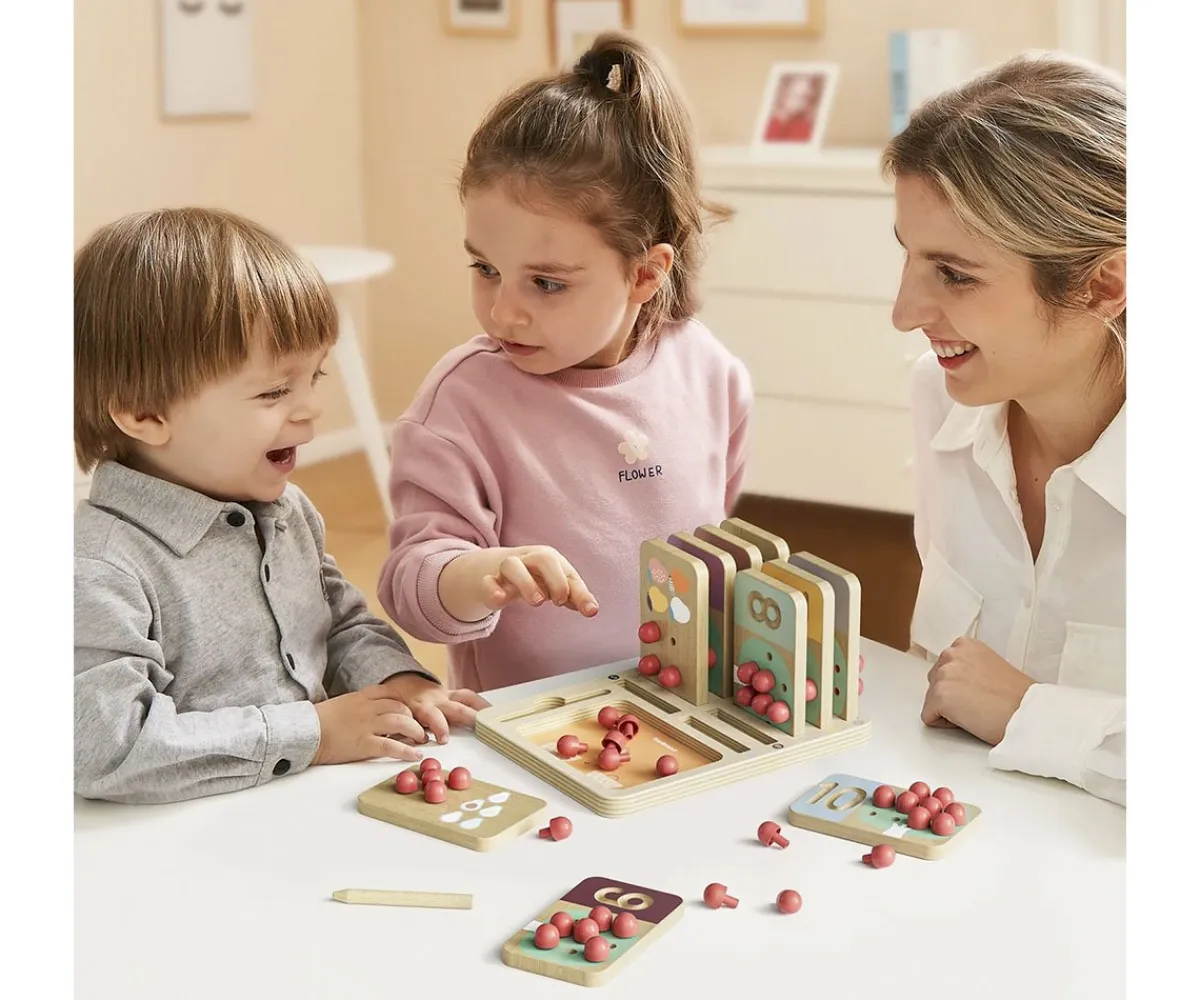 - Incluye: 10 tableros de madera con números de 1 al 10, 55 pequeños pinchos (manzanas), 1 lápiz de madera y base