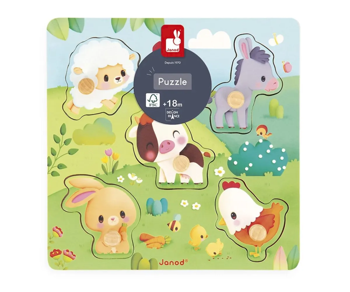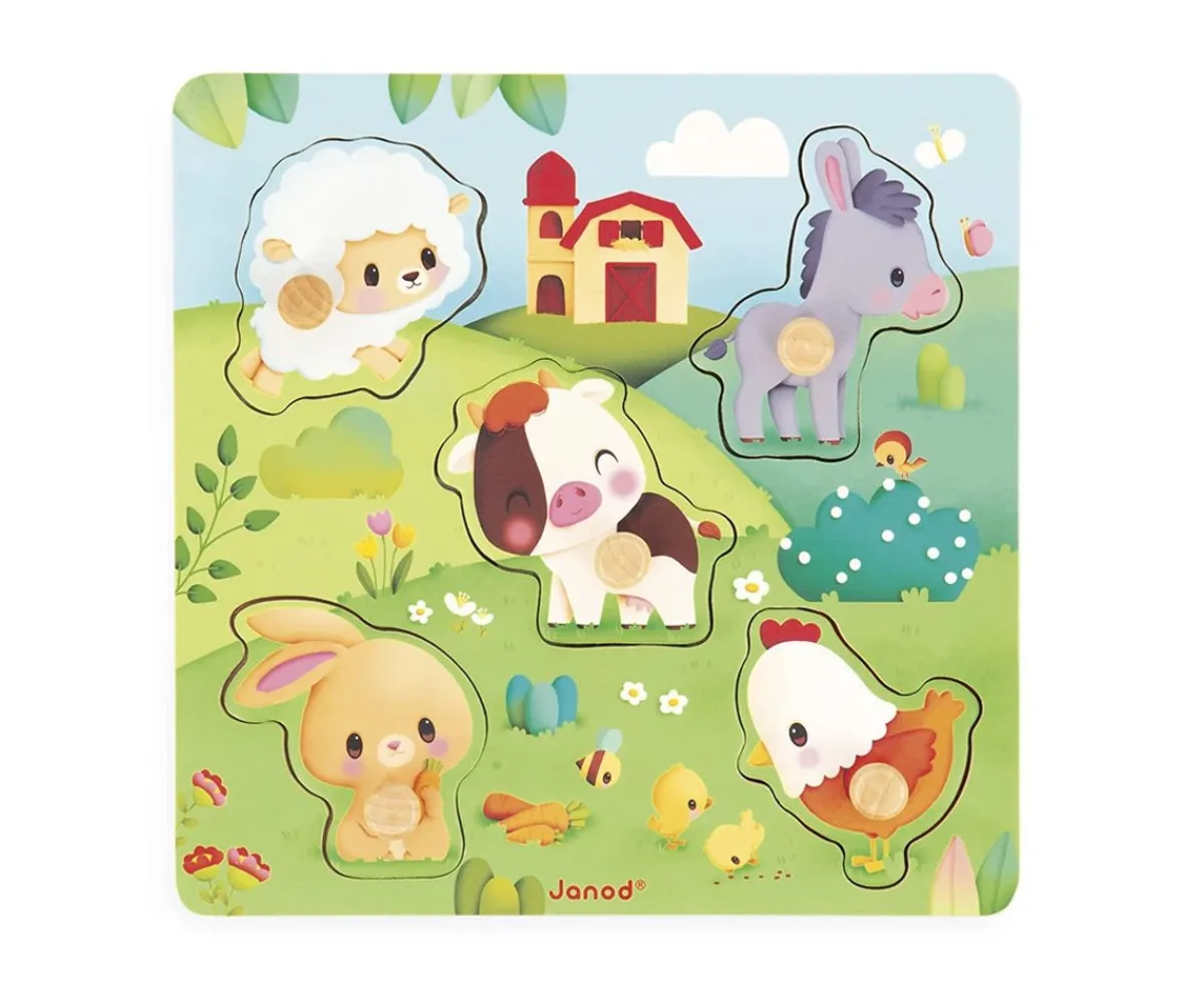 - Incluye: tablero de madera, 5 piezas con forma de animales y clavijas para facilitar el agarre