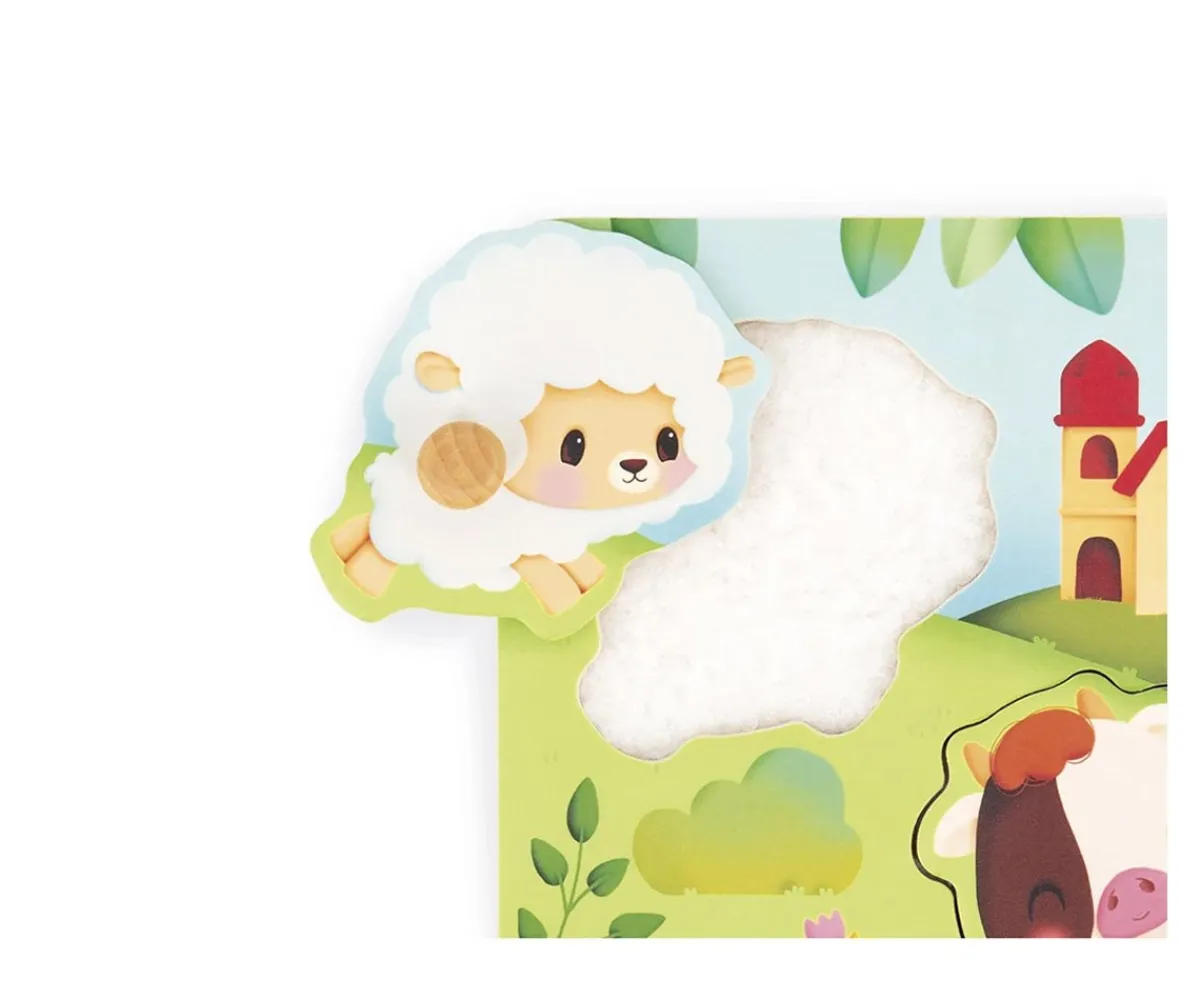Un puzle formado por 5 piezas encajables, con bordes redondeados y clavijas de madera para facilitar el agarre de las manos de los peques. Debajo de cada pieza hay una textura que representa el pelaje del animal que a los peques les encantará tocar con la punta de los dedos.