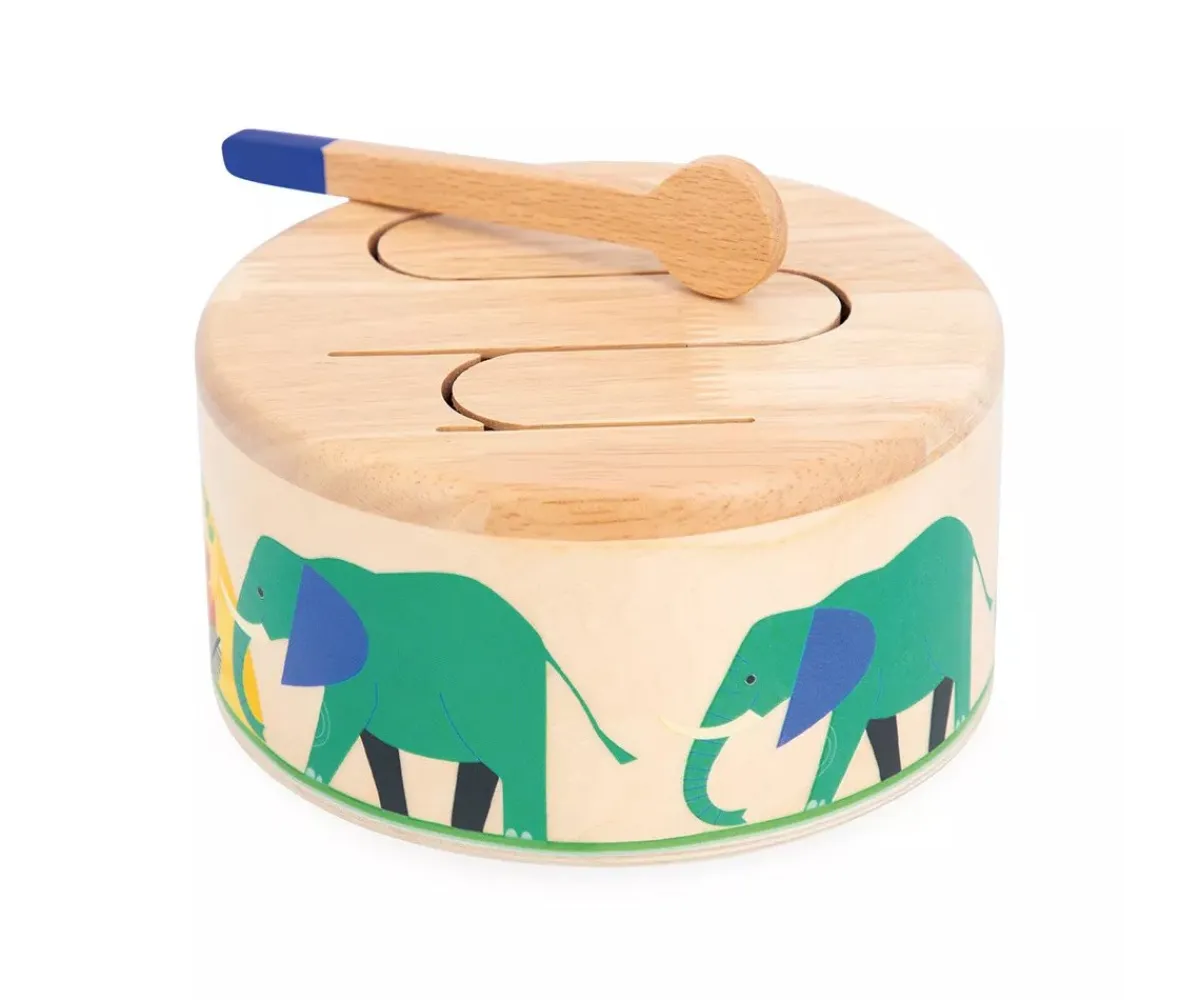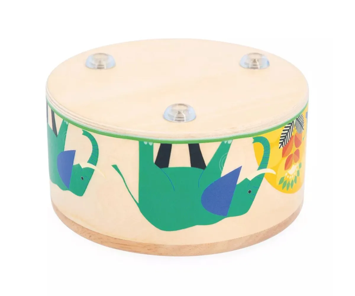 Con ilustraciones encantadoras de las aventuras de un elefante, este tambor de madera fomentará la estimulación del sonido y del ritmo.