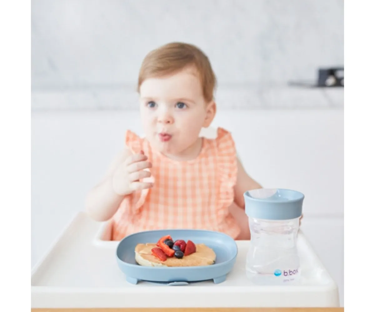 La taza con borde de entrenamiento de B.Box imita el flujo de un vaso de mayores, ya que canaliza el líquido hacia el borde para que los peques beban fácilmente.